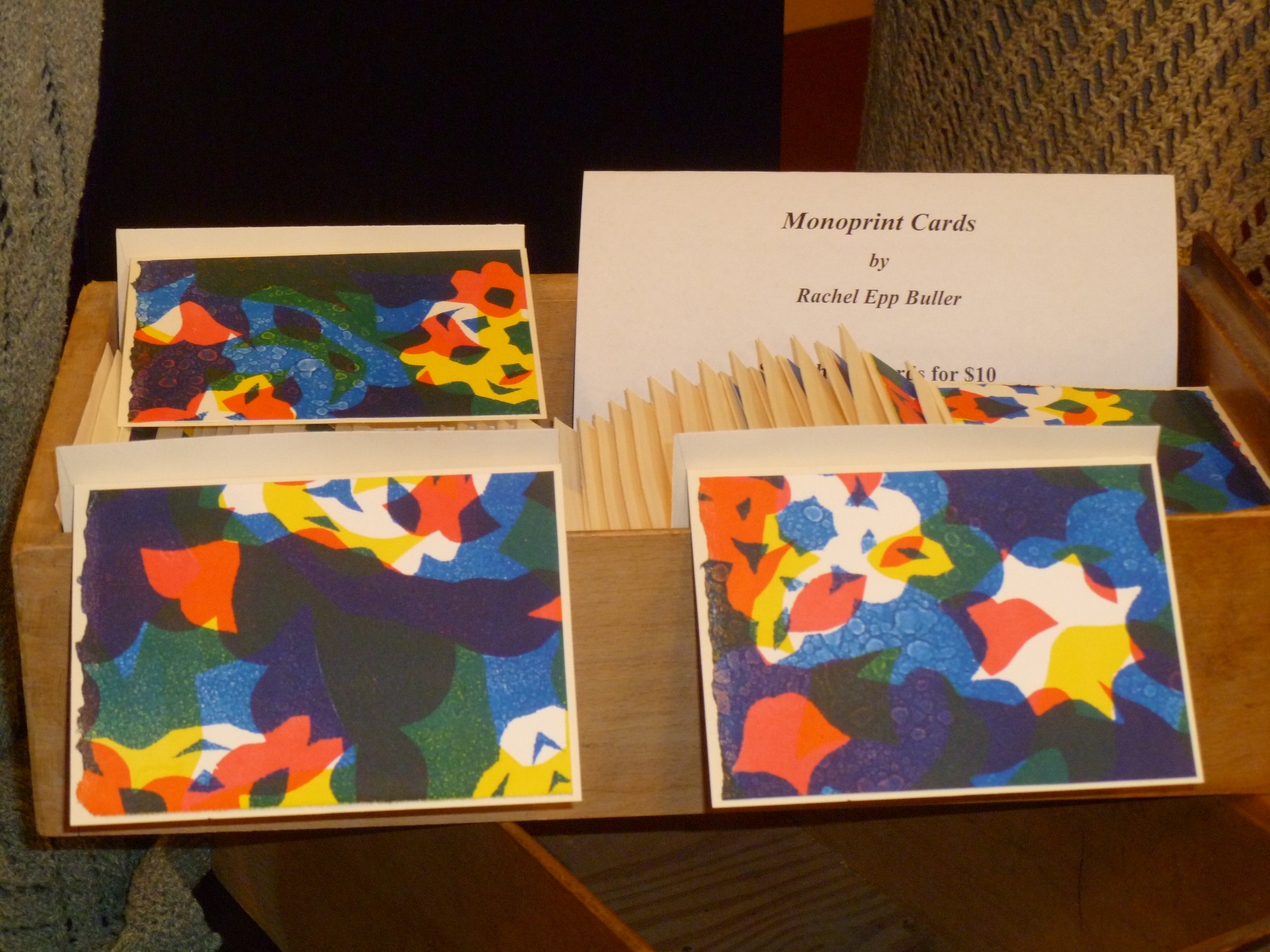 A friend of mine organized the second annual Artists’ Circus, a holiday arts event that opens tonight at the Newton Beadery. It features a wide variety of work from local artists–paintings, drawings, prints, jewelry, photography, fiber, etc. My small contribution to the extravaganza is a set of monoprint cards.