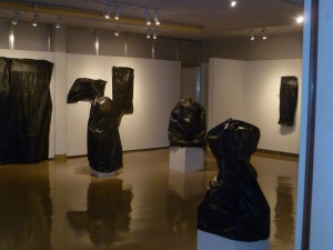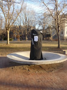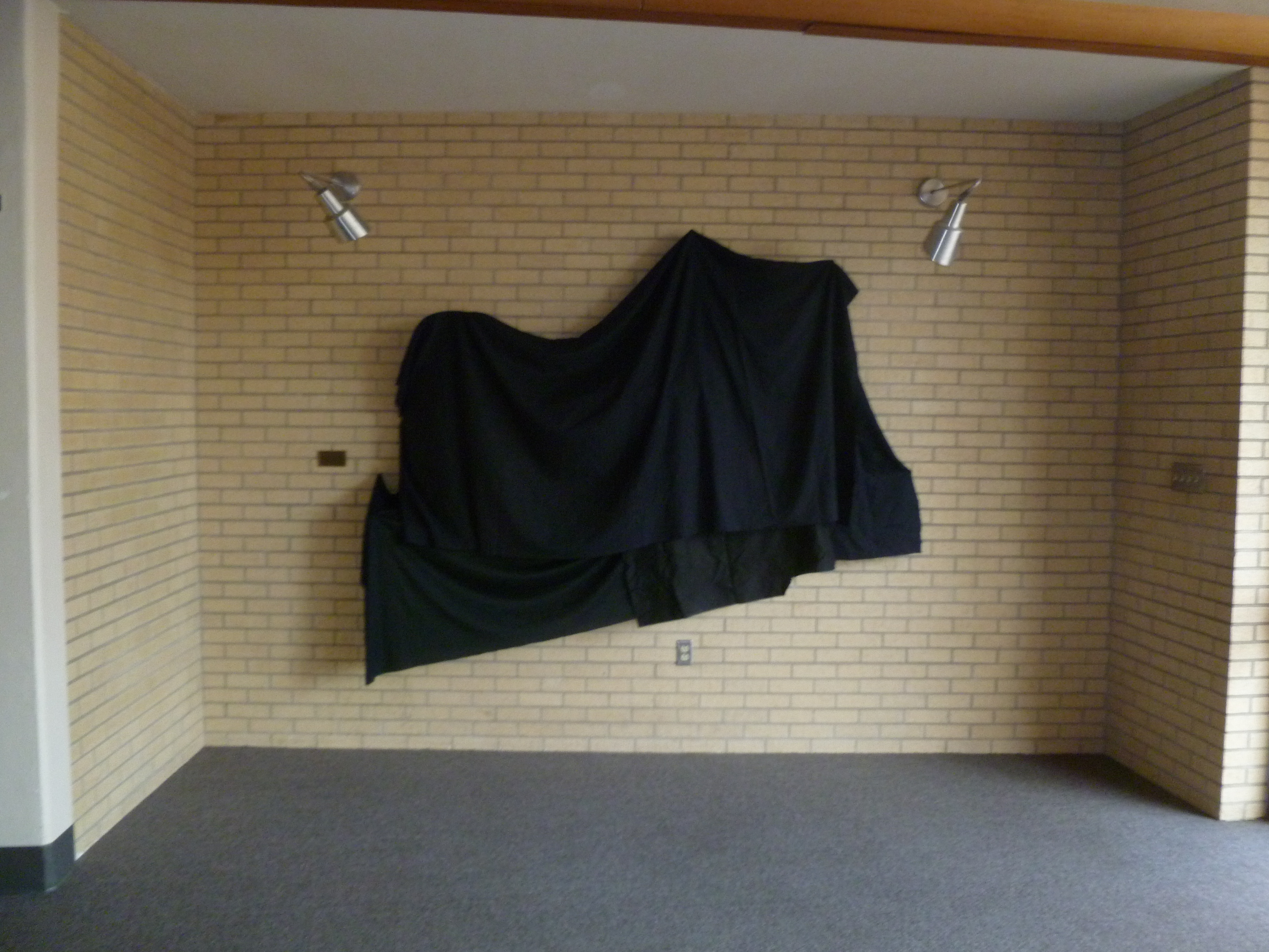 Thanks to the arts advocacy of a large group of Bethel College students and some faculty colleagues, our campus woke up to a constellation of black shrouds. An exhibition in the Fine Arts Center Gallery, the distinctive fountain on the green, and many other pieces of publicly visible art around campus have been covered in black, a gesture that protests Governor Brownback’s executive order to abolish the Kansas Arts Commission. Statements accompanying the veiled artworks invite viewers to imagine Kansas (or at least Bethel College) without art and provide information about the many tangible benefits of arts funding. Through this action, arts supporters at Bethel and in Newton and North Newton are standing in solidarity with arts advocates around the state, whose work is documented on such sites as imaginekansaswithoutart and Kansas Citizens for the Arts.