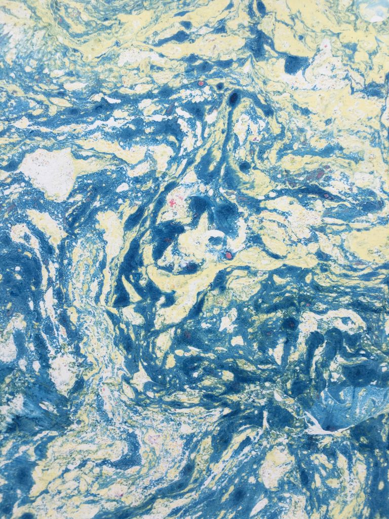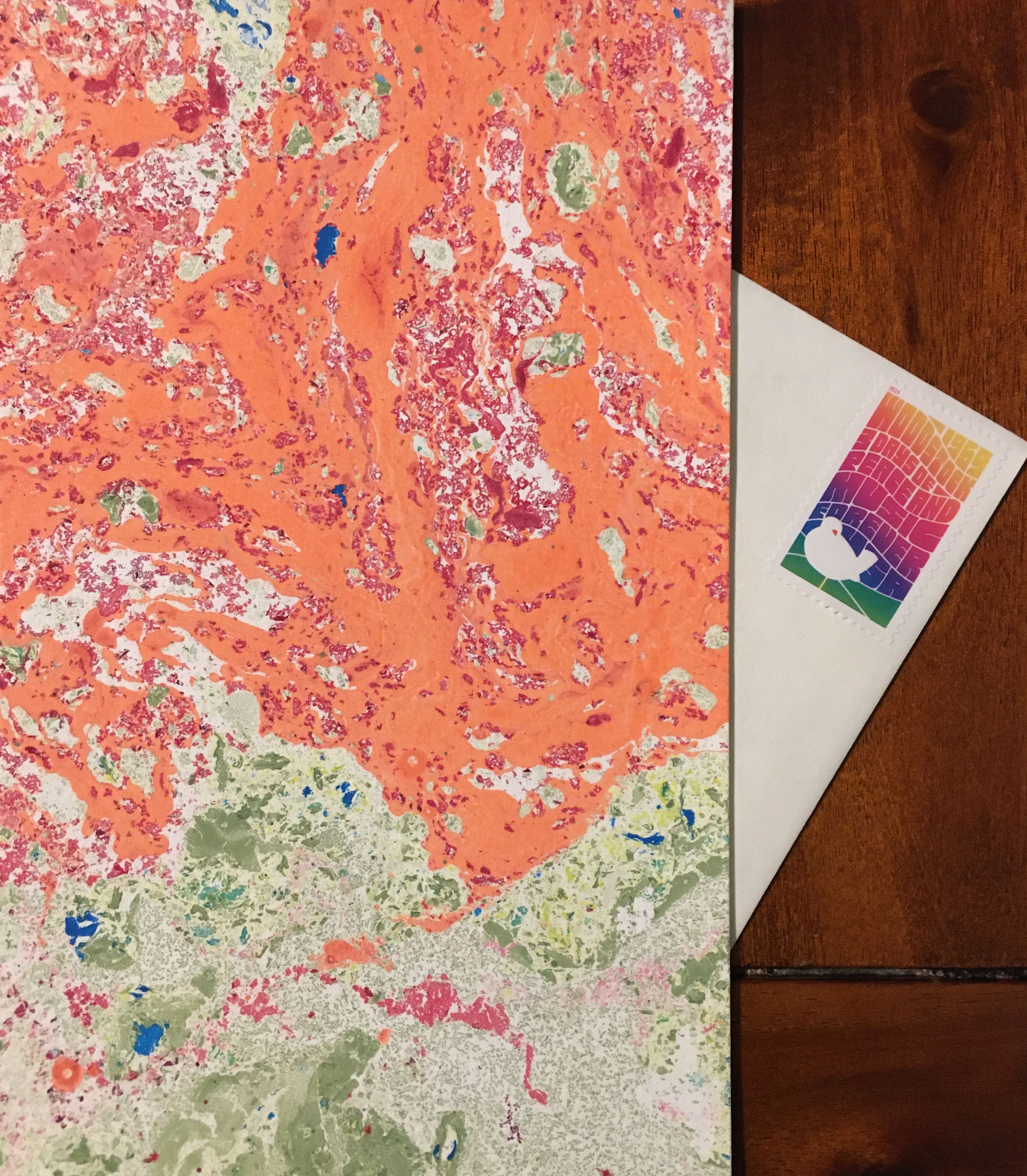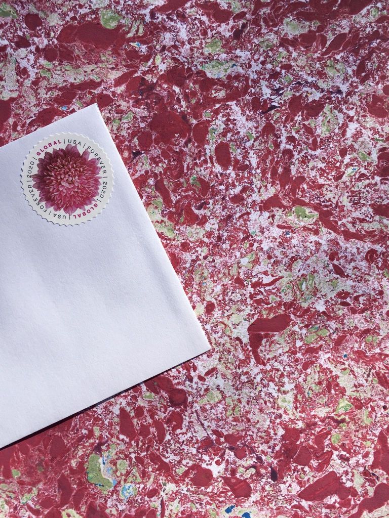 Do people still write letters? I miss them dearly. Emails don’t really count, I mean sometimes they almost do, but rarely and never entirely. A letter is a handmade thing, touched by one person and sent to another through the magical system of the post. Countless aesthetic choices exist—lined paper or patterned stationery, pencil or green felt tip pen, American flag or Lunar New Year stamp—and that’s not to mention the possibility of collage, drawings, and the inclusion of small flat objects. In this time of isolation, of the world slowing down so much it can seem as if it has stopped, Rachel Epp Buller has made a daily practice of this outmoded form. Today she’ll have mailed off letter number 105 of the “Pandemic Epistles,” marking 105 days of quarantine and 105 acts of communicative care. Each is penned on a piece of paper Buller has marbled, moody folios that under present conditions recall viruses more than paisleys or waves. She sends them to someone, somewhere, in a gesture that feels just right for right now: safe, steady, social and blessedly screen-free. With gratitude to the mail carriers, whose motto may need to be amended beyond snow, rain, heat and gloom of night to include threat of contagion.