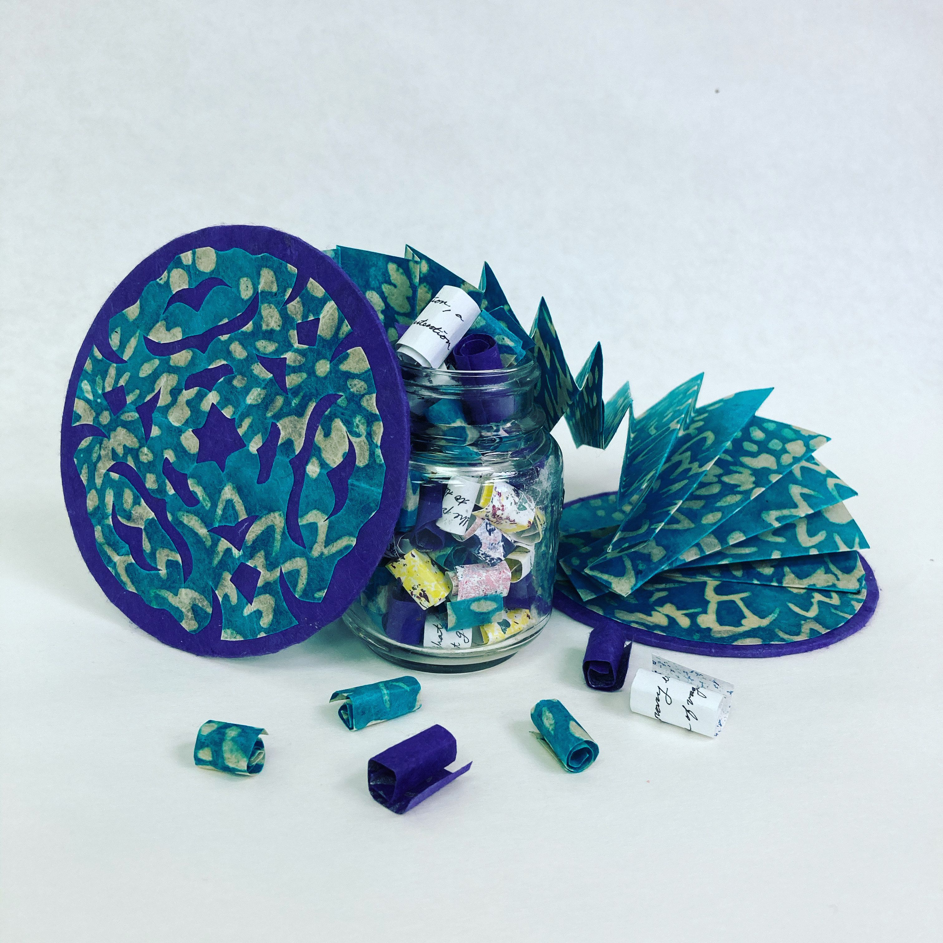 Our exchange of words led us down meandering paths, toward found materials, collages, artist books, paper sculptures, and installations. We suspended unbound pages, repurposed antique scrap albums, grew word vines that crawled across the wall, inserted tiny bits of text into make-up compacts, folded handmade papers, tucked vintage photos into cigar boxes with captions.