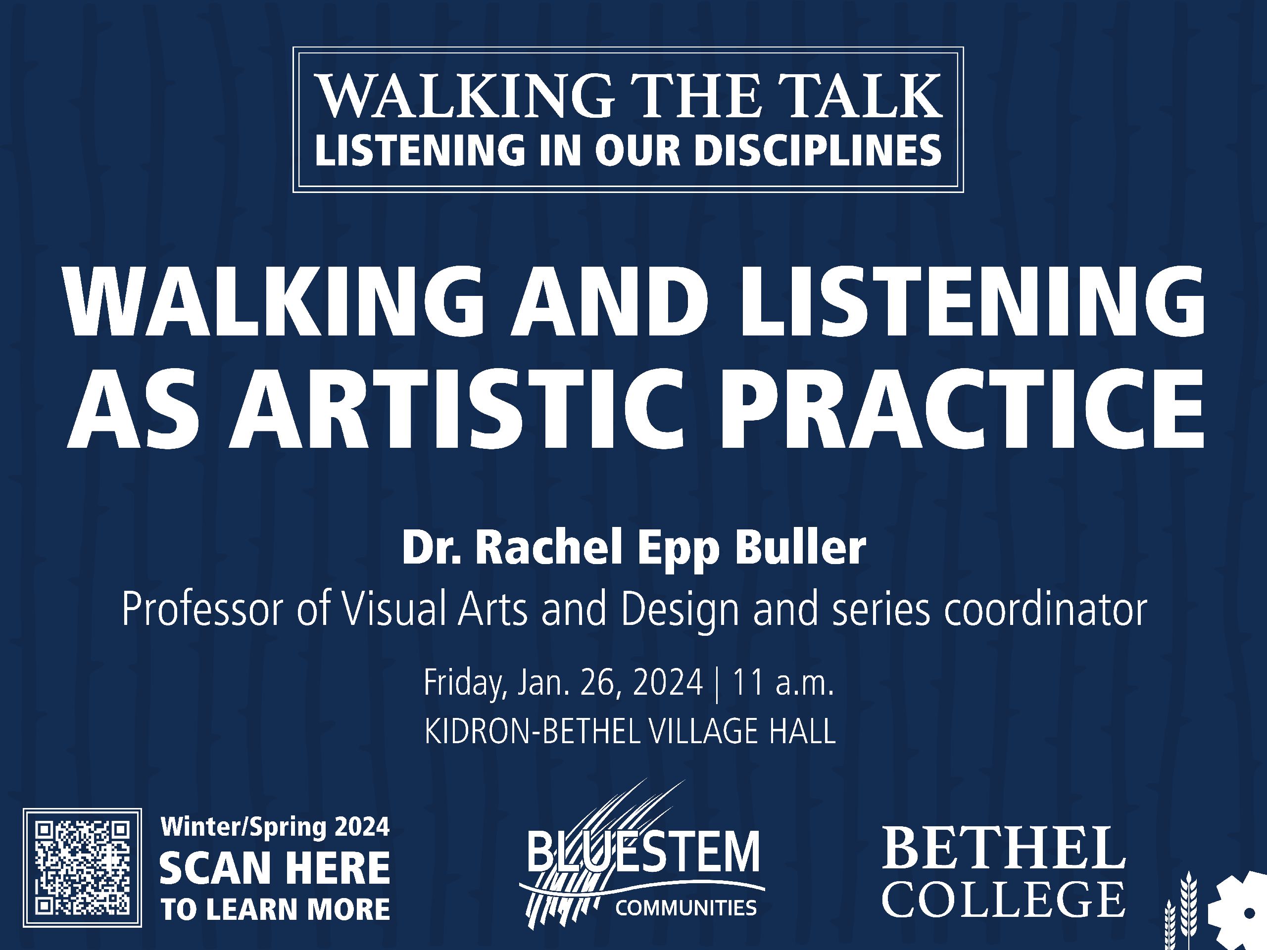 This speaker series will build momentum for a day-long symposium (again, free and open to the public) that I will host on the Bethel campus on April 27, 2024. Walking the Talk: Listening Relationships in a Changing Climate will feature regional speakers from The Land Institute, Washburn University, the Spencer Museum, and the Kansas Institute for Peace and Conflict Resolution. Our keynote speaker will be Dr. Sheena Wilson from the University of Alberta, and the Slow Art for Fast Times students will be leading participatory walking/listening activities.