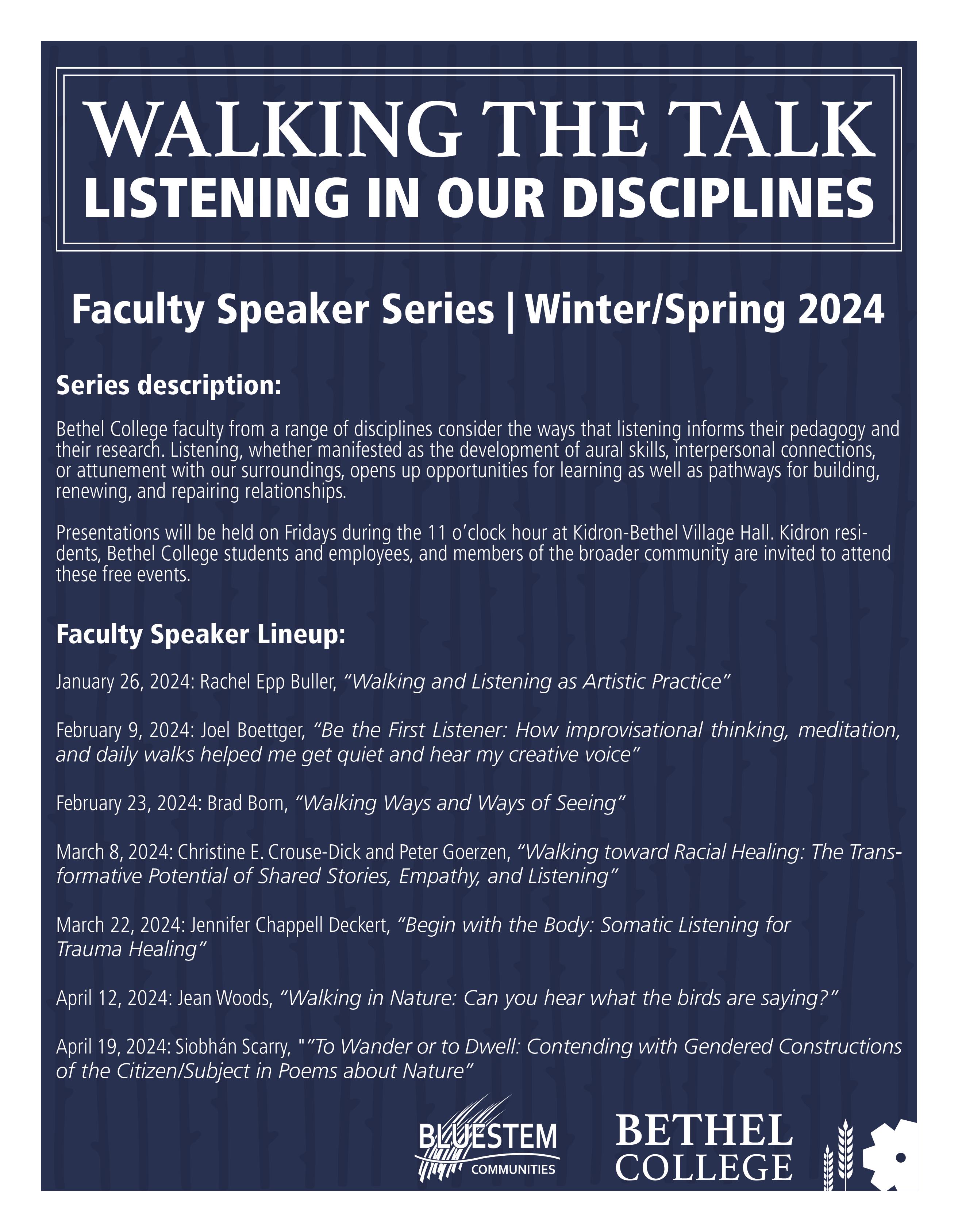 As a way to extend students’ learning beyond the classroom, and as a way to foster connection on our small campus, I’ve organized a semester-long faculty speaker series called Walking the Talk: Listening in our Disciplines. I issued the invitation to my colleagues last fall and I’m grateful for everyone who either volunteered to participate or said yes when I tapped them on the shoulder. The speaker series is free and open to the public and we’re hosting it at Kidron-Bethel Village (part of Bluestem Communities), the retirement facility just adjacent to the Bethel College campus. I gave the inaugural talk last Friday. We had a packed house and it was wonderful to see an intergenerational audience of students, retirees, and community members.