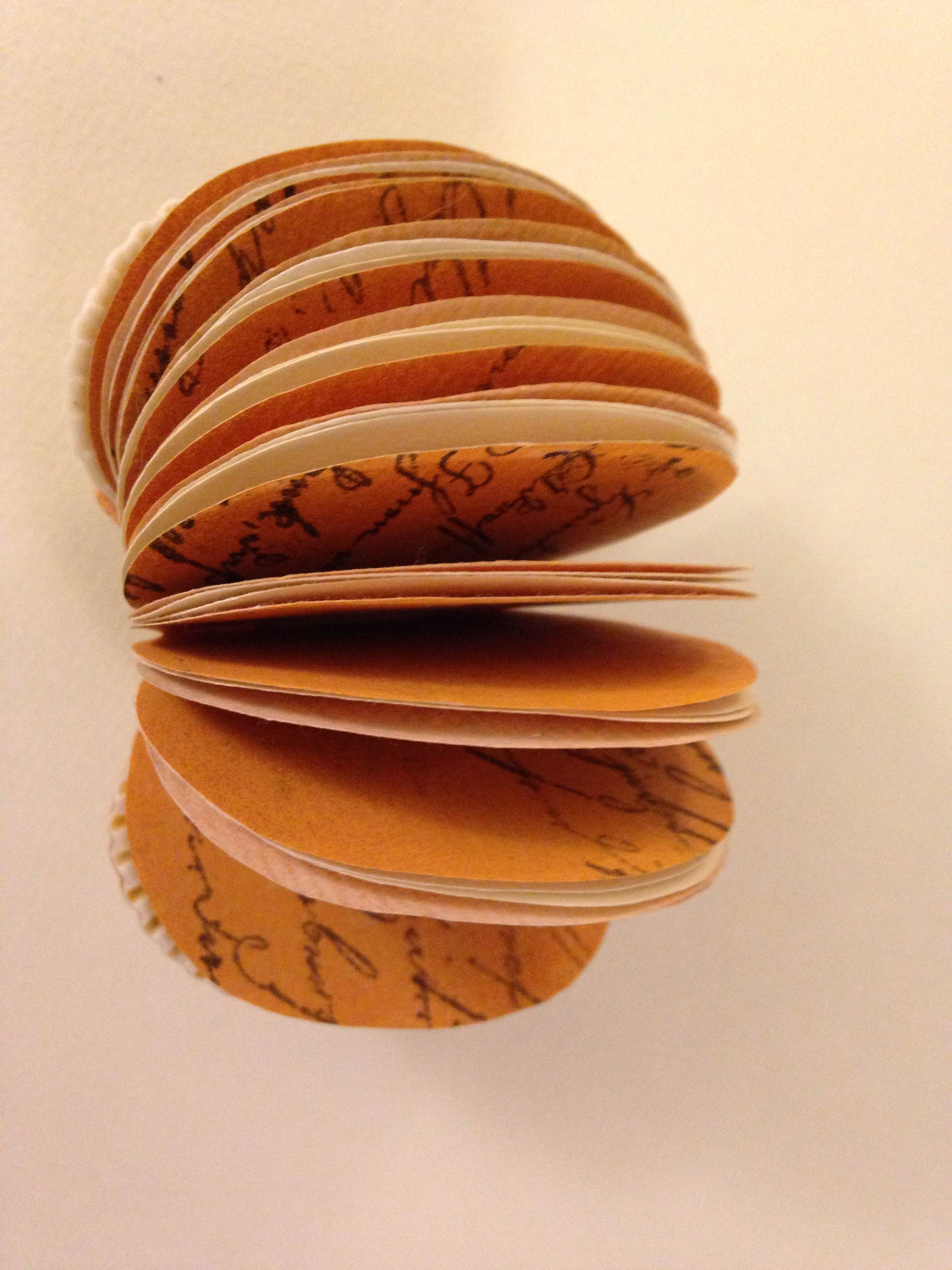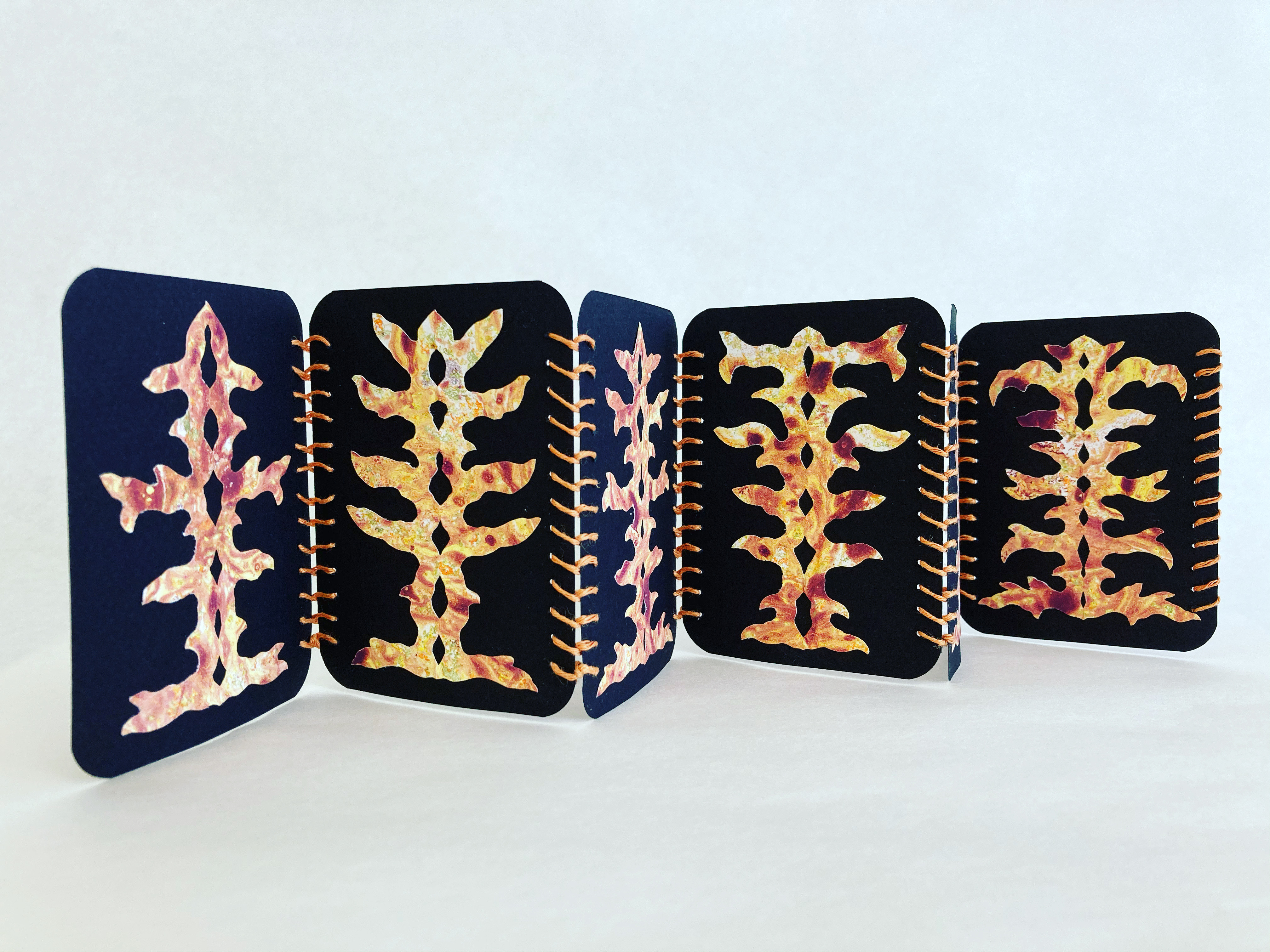 our only hope for survival is to take cover and wait, Japanese Boro mending stitch with hand-marbled paper-cuts, 4×3″Keep still. Wait. This is the moment of no turning back. Hanging installation of handmade paper and stitched papercuts.this temporary disruption, a conversation of vague intention. Spiral accordion book with papercuts and paper scrollsA fragile creature, she fears rodents, the elements, and clumsy hands, rust prints with cut paper and Coptic stitch, 4×6″Now the garden is gone to seed, monotype prints with Coptic and centipede stitching, 4×5″Our backyard miracle began on the south side of the house, monoprinting with lotus blossom stitch, 4×6″We survive storms with laughter, spiral accordion and handmade papers, 3.5″ diameterHave you planted the marigold seeds that I sent? accordion fold with handmade seeded papers, 4×2.5″I imagine three nights of full moon, accordion and flower folds with monoprinting, 3×3″