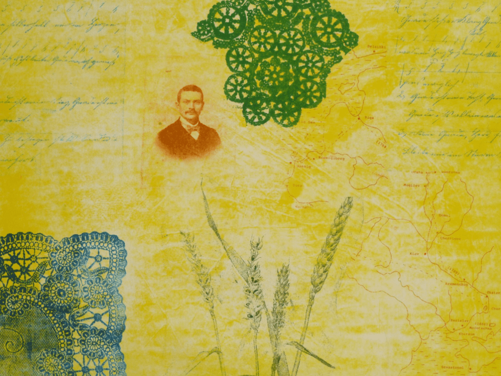Monotypes with “paper litho” transfers exploring family and cultural heritage, 2010-12